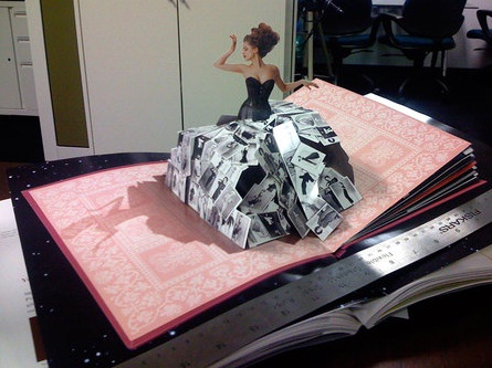 這張照片取自這網站,裡頭有更豐富的照片。這本書之所以問世是因為紀念美國德州達拉斯內曼馬庫斯百貨集團創立100週年的精品目錄立體書。根據「立體書的異想世界」網站,「當時除了用來促銷集團銷售的精品百貨,這本限量立體書也把自己 列入2007年耶誕精品。內容主軸是美少女穿越時空,化身為各類精品模特兒,展示內曼馬庫斯百貨百年來銷售的精品,最後蛻變成嫵媚動人的 淑女。設計風格宛如立體書版的時尚雜誌。大量採用時尚攝影師傑夫肯恩作品並融入插畫之中,再由荷蘭紙藝工程師凱斯慕比克展現如真似幻 的華麗場景。」光看了照片我也忍不住幻想自己就是書中的女主角!