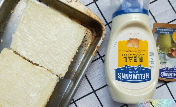 輕輕將美乃滋均勻塗抹在吐司再送進烤箱烤一烤。