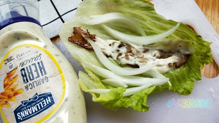 我個人其實吃了美生菜、醃肉佐Hellmann's 巴西利蒜香醬,覺得很多汁。