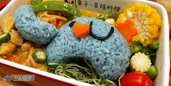 咖哩馬鈴薯燴雞肉的米是用蝶豆花天然染色。
