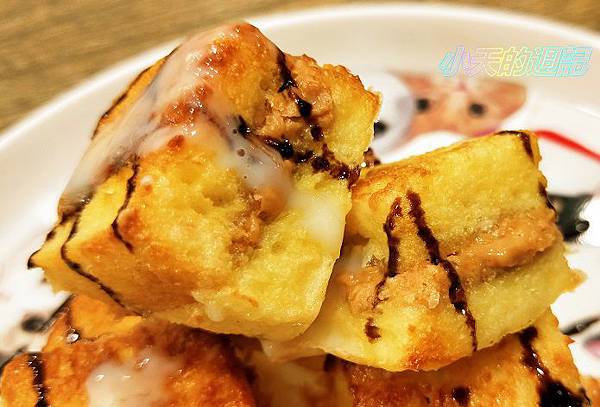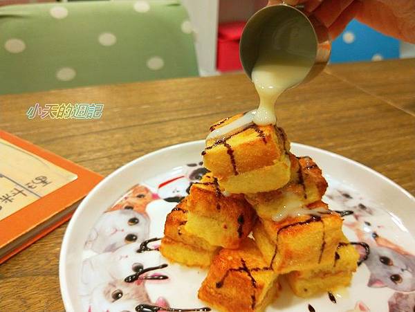 鬆軟的吐司,吃得出花生顆粒,本身就淋上巧克力醬,再淋上煉乳,甜甜的口感又不會膩,配貴族貓奶茶真的超搭的。
