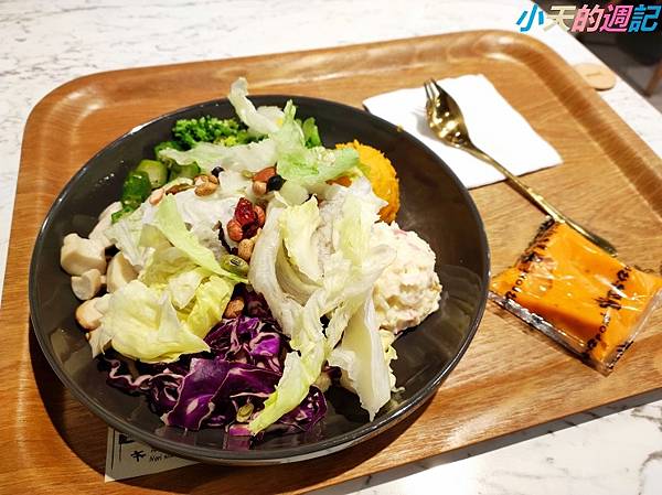 佐菜,我選花椰菜、秋葵、杏鮑菇、紫甘藍、地瓜、蛋薯沙拉。