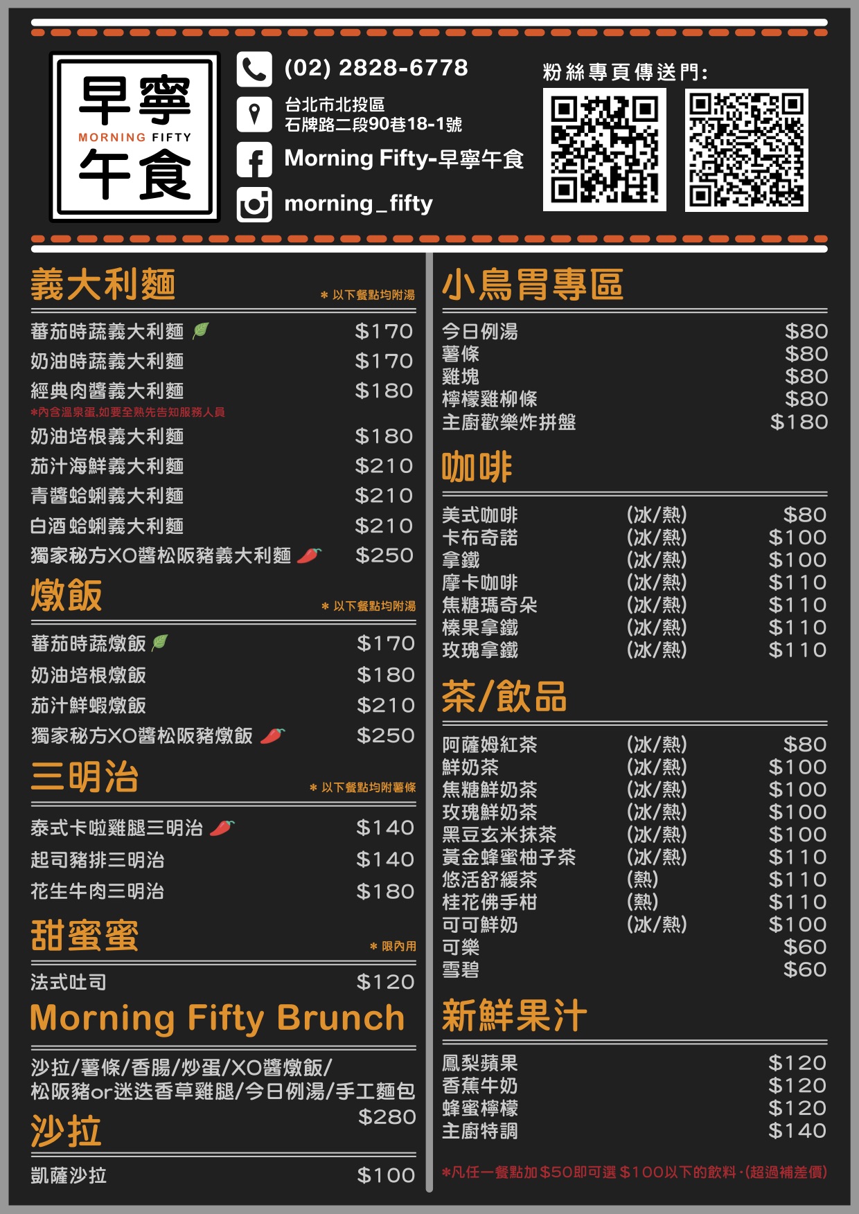 早寧午食 Morning Fifty Pasta & Cafe 餐廳前方有菜單可參考。